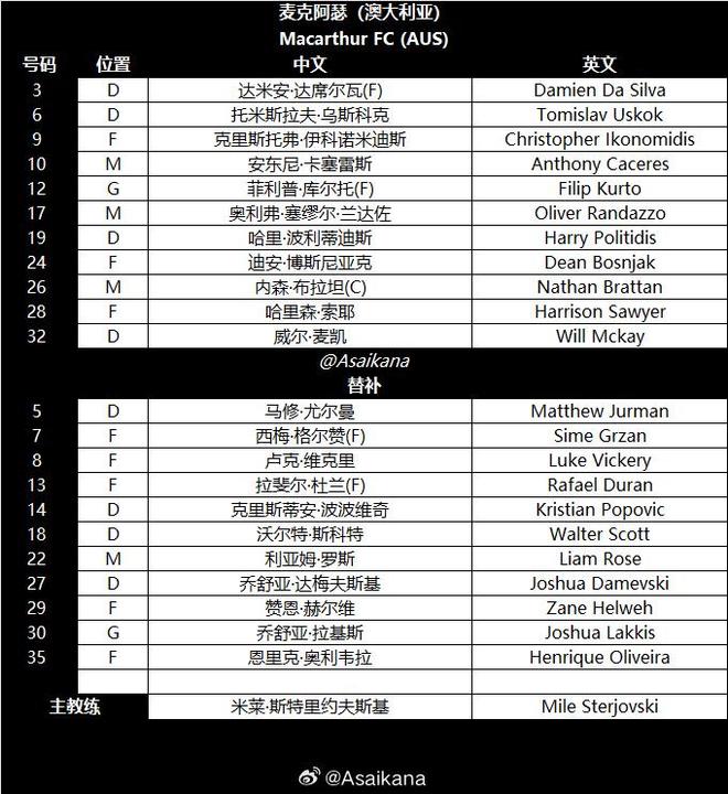 麦克阿瑟FC首发阵容:12-库尔托、3-达席尔瓦、6-乌斯科克、19-波利蒂迪斯、32-麦凯、26-布拉坦、10-卡塞雷斯、9-伊科诺米迪斯、28-索耶、24-博斯尼亚克、17-兰达佐